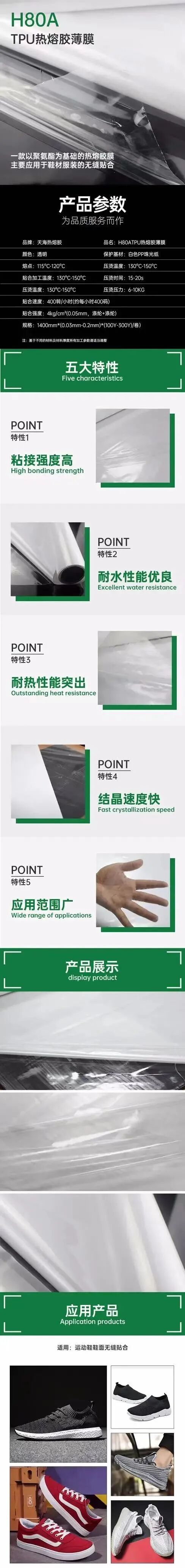 一款以聚氨酯为基础的热熔胶膜主要用于鞋材服装的无缝贴合。使用优质原料,生产工艺成熟,产品各方面性能稳定,粘接强度高,耐热性能突出,结晶速度快。