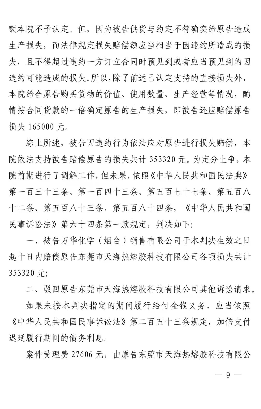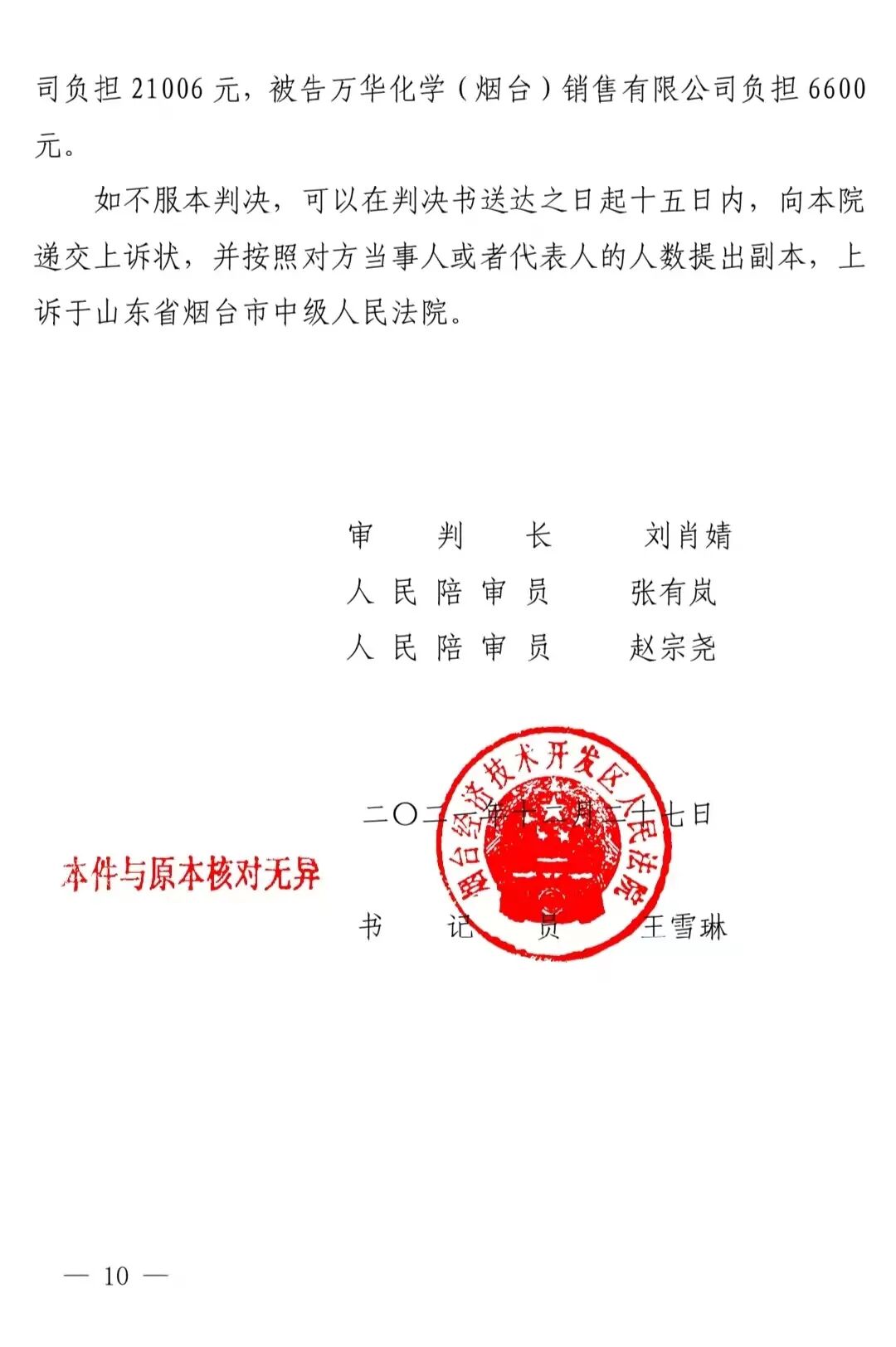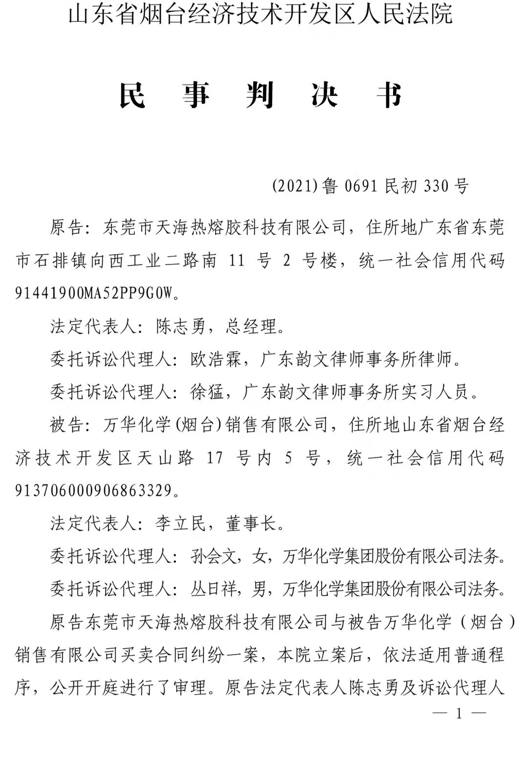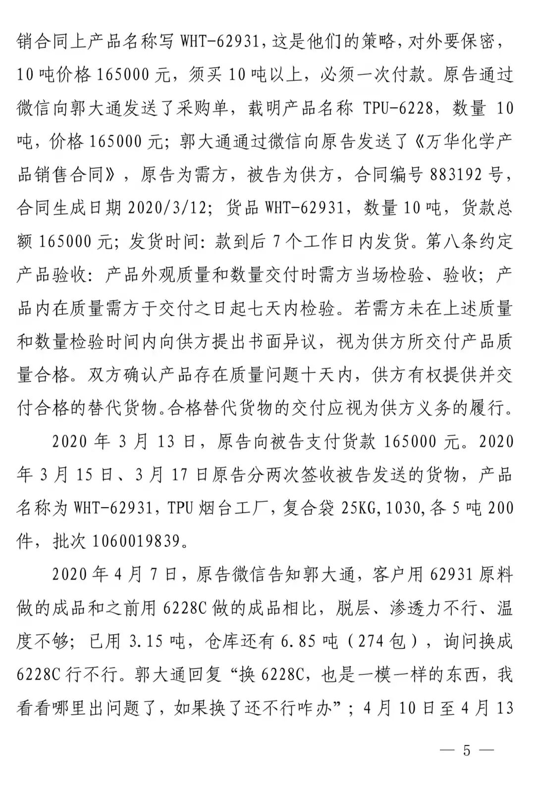 天海与烟台万华之品质纠纷经由烟台经开区法院审定:烟台万华存在偷换包装,欺瞒顾客之行为,承担相应之过错。但天海公司对于错误在烟台万华、损失由天海承担之判决不服,将继续上诉!