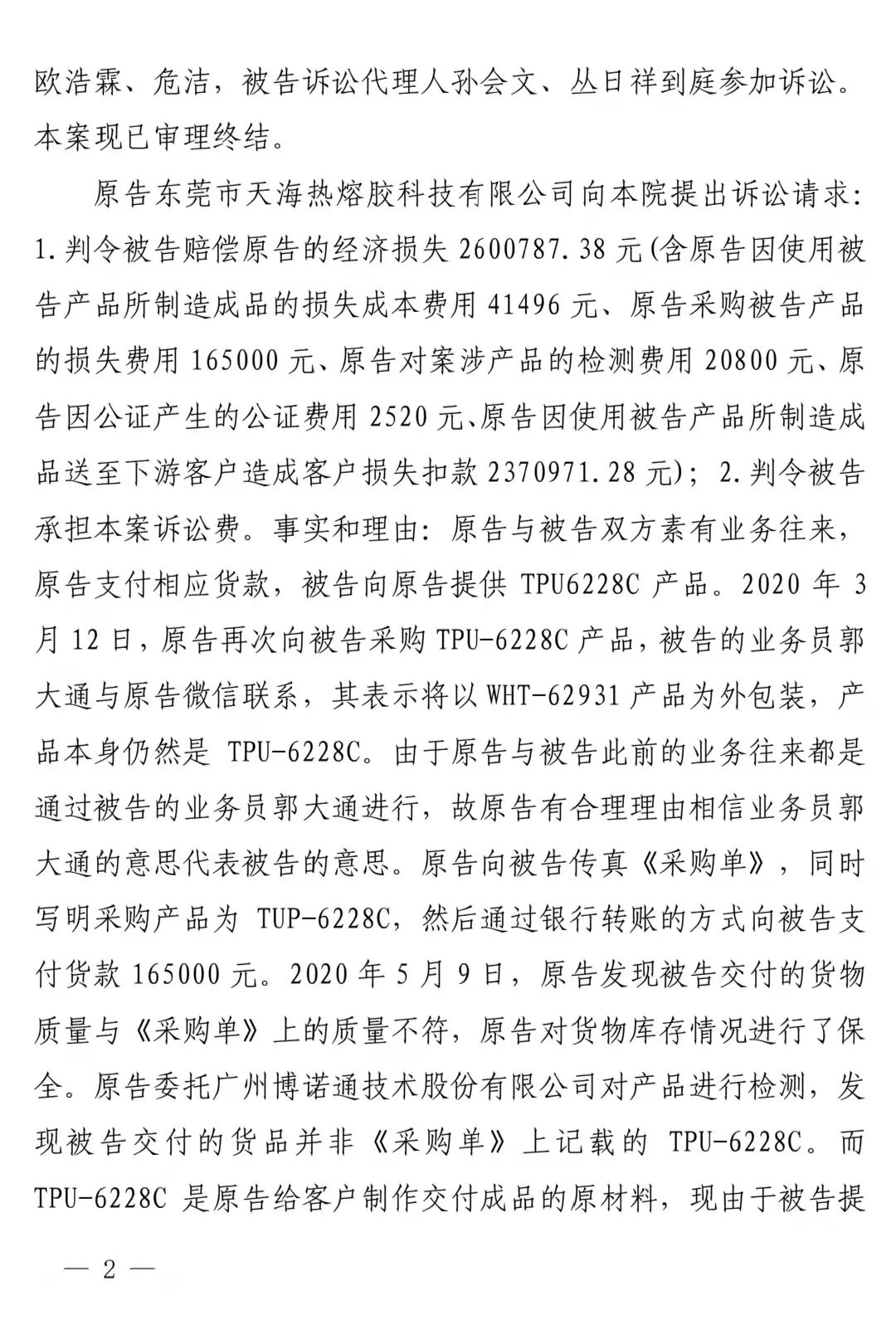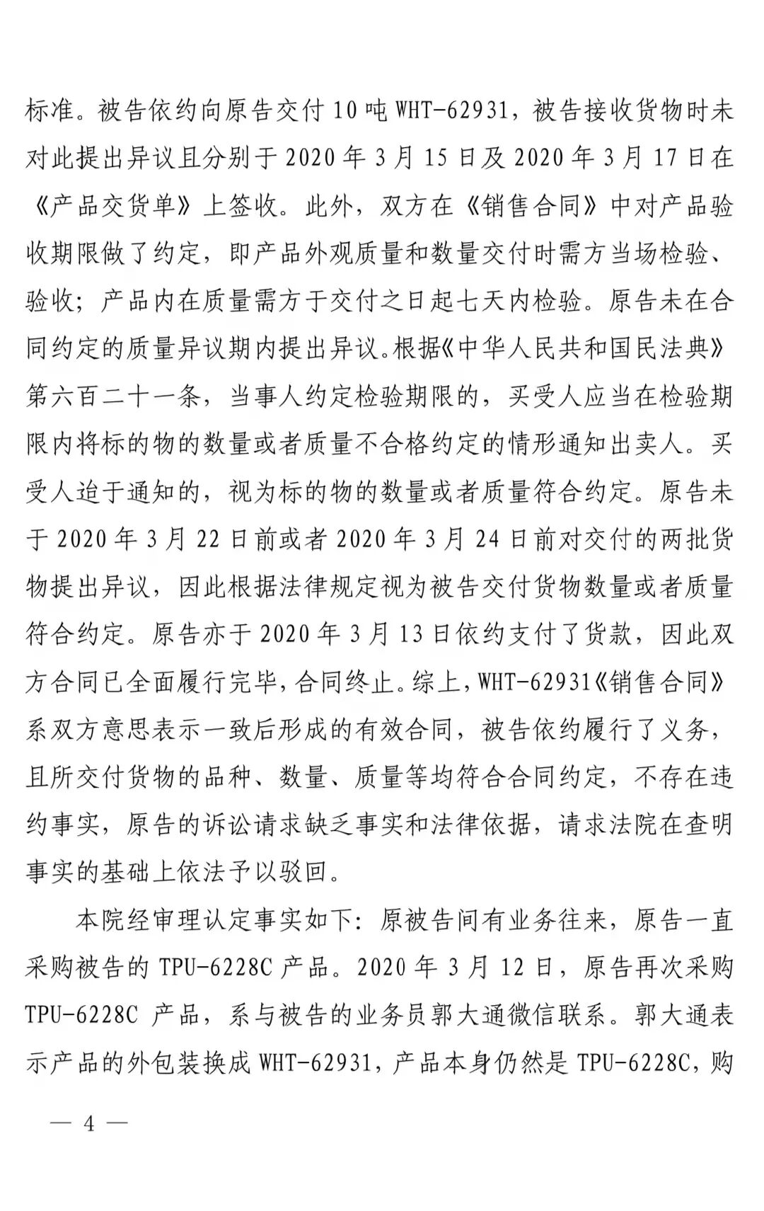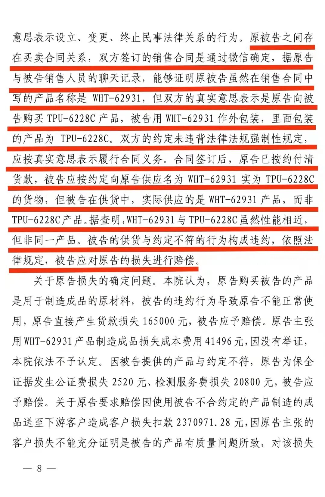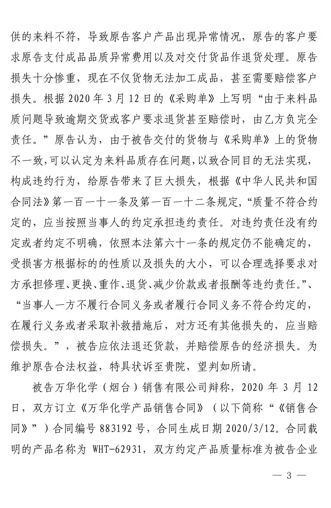 天海与烟台万华之品质纠纷经由烟台经开区法院审定:烟台万华存在偷换包装,欺瞒顾客之行为,承担相应之过错。但天海公司对于错误在烟台万华、损失由天海承担之判决不服,将继续上诉!